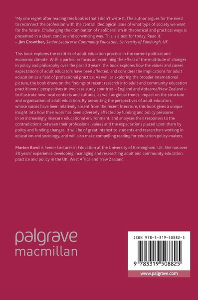 This book explores the realities of adult education practice in the current political and economic climate. With a particular focus on examining the effect of the multitude of changes in policy and philosophy over the past 30 years, the book explores how the values and career expectations of adult educators have been affected, and considers the implications for adult education as a field of professional practice. As well as exploring the broader international picture, the book draws on the findings of recent research into adult and community education practitioners' perspectives in two case study countries - England and Aotearoa/New Zealand - to illustrate how local contexts and cultures, as well as global trends, impact on the structure and organisation of adult education. By presenting the perspectives of adult educators, whose voices have been relatively absent from the recent literature, this book gives a unique insight into how their work has been adversely affected by funding and policy pressures in an increasingly insecure educational environment, and analyses their responses to the contradictions between their professional values and the expectations placed upon them by policy and funding changes. It will be of great interest to students and researchers working in Education and Sociology, and will also make compelling reading for policy-makers.