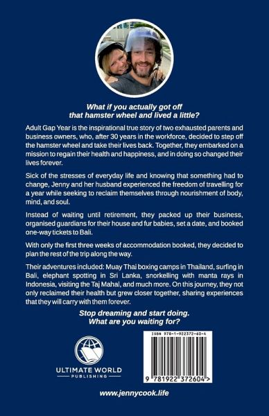 What if you actually got off thathamster wheel and lived a little? Adult Gap Year is the inspirational true story of two exhausted parents and business owners, who, after 30 years in the workforce, decided to step off the hamster wheel and take their lives back. Together, they embarked on a mission to regain their health and happiness, and in doing so changed their lives forever. Sick of the stresses of everyday life and knowing that something had to change, Jenny and her husband experienced the freedom of travelling for a year while seeking to reclaim themselves through nourishment of body, mind, and soul. Instead of waiting until retirement, they packed up their business, organised guardians for their house and fur babies, set a date, and booked one-way tickets to Bali. With only the first three weeks of accommodation booked, they decided to plan the rest of the trip along the way. Their adventures included: Muay Thai boxing camps in Thailand, surfing in Bali, elephant spotting in Sri Lanka, snorkelling with manta rays in Indonesia, visiting the Taj Mahal, and much more. On this journey, they not only reclaimed their health but grew closer together, sharing experiences that they will carry with them forever. Stop dreaming and start doing. What are you waiting for?