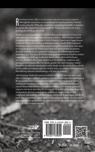 Restorative justice (RJ) is an idea whose time may have finally arrived. Although the concept has ancient roots and the term has existed in Western societies since the 1970s, only recently has it gained general public recognition. In schools, RJ's popularity is rising world-wide. In fact, education is the fastest growing area for the practice of RJ. Despite an increasing number of schools embracing the approach, it is not clear what educational RJ practitioners are trying to achieve. Adult Intentions, Student Perceptions: How Restorative Justice is Used in Schools to Control and to Engage focuses on the use of RJ in one school in Scotland and one in Canada. While important to understand the intentions of educators in using RJ in schools, those aims must be examined alongside the actual impact that such practices have on students. RJ can be understood and experienced in dramatically different ways by those implementing it. For some, RJ is about creating an environment of and for student engagement that challenges traditional systems of discipline and facilitates learning. For others, RJ is simply another tool for solidifying compliance and meting out punishment, albeit in a kinder, gentler way. Adult Intentions, Student Perceptions provides the opportunity to delve deeply into the stories of two schools and the adults and young people who inhabit them, and consider the broad impact that differing educator understandings of RJ have on students. Adult Intentions, Student Perceptions is a timely book for RJ advocates and critics alike. It challenges a common assumption of some RJ advocates that implementing RJ necessarily creates a classroom environment of social engagement (where students are empowered to engage with one another and think critically, and school relationships and hierarchies are transformed). The student experience relayed in this book shows that RJ can as readily be mobilized to create classroom environments of social control (where students are taught obedience and compliance, and authority and hierarchy are reinforced). Reimer argues that RJ, by itself, does not guarantee certain qualities of relationship, but RJ does allow us to examine relational qualities and ask questions of how school relationships are used to engage and/or control students.
