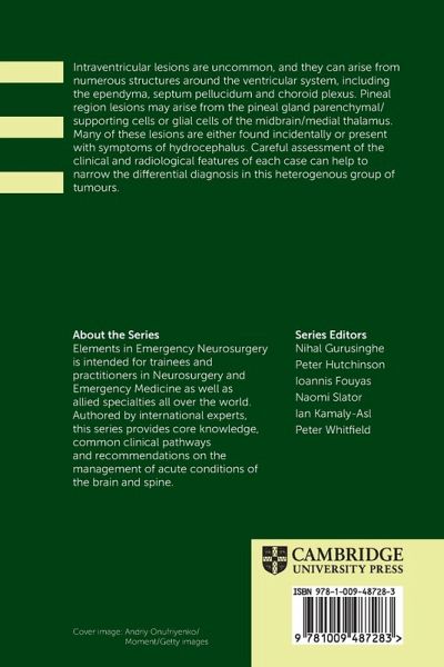 This Element describes the management of patients with lesions in the ventricular system and pineal region. Careful assessment of the clinical and radiological features of each case can help to narrow the differential diagnosis in this heterogenous group of tumours.