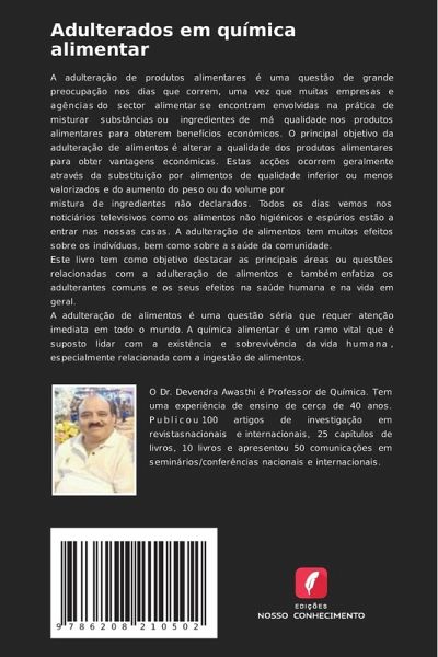 A adulteração de produtos alimentares é uma questão de grande preocupação nos dias que correm, uma vez que muitas empresas e agências do sector alimentar se encontram envolvidas na prática de misturar substâncias ou ingredientes de má qualidade nos produtos alimentares para obterem benefícios económicos. O principal objetivo da adulteração de alimentos é alterar a qualidade dos produtos alimentares para obter vantagens económicas. Estas acções ocorrem geralmente através da substituição por alimentos de qualidade inferior ou menos valorizados e do aumento do peso ou do volume pormistura de ingredientes não declarados. Todos os dias vemos nos noticiários televisivos como os alimentos não higiénicos e espúrios estão a entrar nas nossas casas. A adulteração de alimentos tem muitos efeitos sobre os indivíduos, bem como sobre a saúde da comunidade.Este livro tem como objetivo destacar as principais áreas ou questões relacionadas com a adulteração de alimentos e também enfatiza os adulterantes comuns e os seus efeitos na saúde humana e na vida em geral.A adulteração de alimentos é uma questão séria que requer atenção imediata em todo o mundo. A química alimentar é um ramo vital que é suposto lidar com a existência e sobrevivência da vida humana , especialmente relacionada com a ingestão de alimentos.