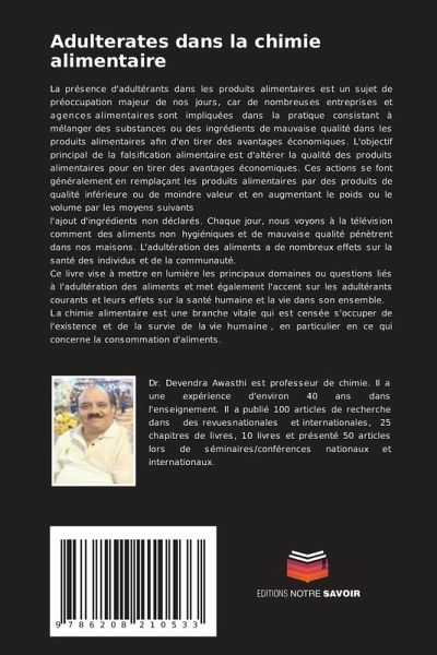 La présence d'adultérants dans les produits alimentaires est un sujet de préoccupation majeur de nos jours, car de nombreuses entreprises et agences alimentaires sont impliquées dans la pratique consistant à mélanger des substances ou des ingrédients de mauvaise qualité dans les produits alimentaires afin d'en tirer des avantages économiques. L'objectif principal de la falsification alimentaire est d'altérer la qualité des produits alimentaires pour en tirer des avantages économiques. Ces actions se font généralement en remplaçant les produits alimentaires par des produits de qualité inférieure ou de moindre valeur et en augmentant le poids ou le volume par les moyens suivantsl'ajout d'ingrédients non déclarés. Chaque jour, nous voyons à la télévision comment des aliments non hygiéniques et de mauvaise qualité pénètrent dans nos maisons. L'adultération des aliments a de nombreux effets sur la santé des individus et de la communauté.Ce livre vise à mettre en lumière les principaux domaines ou questions liés à l'adultération des aliments et met également l'accent sur les adultérants courants et leurs effets sur la santé humaine et la vie dans son ensemble.La chimie alimentaire est une branche vitale qui est censée s'occuper de l'existence et de la survie de la vie humaine , en particulier en ce qui concerne la consommation d'aliments.