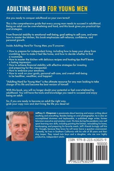 Are you ready to conquer adulthood on your own terms? This is the comprehensive guide that every young man needs to succeed in adulthood. Being an adult can be overwhelming and hard, and this book gives you practical tips and strategies. From financial stability to emotional well-being, goal setting to self-care, and even how to master the kitchen, this book emphasizes self-reliance, confidence, and personal growth. Inside Adulting Hard for Young Men, you'll uncover:How to prepare for independent living, including how to keep your place from crumbling, how to make it feel like home, and how to decide whether to find a roommate. How to master the kitchen with delicious recipes and hosting tips that'll leave a lasting impression. How to achieve financial stability with effective strategies for investing and preparing for the unexpected. How to embrace your emotions. How to work on your goals, personal self-care, and overall well-being to be healthier, wealthier, and happier! "Adulting Hard for Young Men" is the ultimate resource for any man looking to take charge of his life and become the best version of himself. With this book, you will no longer doubt your potential or feel overwhelmed by adulthood. You will have the tools and knowledge you need to succeed and enjoy being an adult. So, if you are ready to become an adult the right way, grab your copy now and start living the life you deserve!