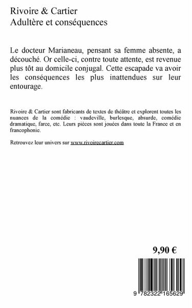 Rivoire & Cartier sont fabricants de textes de théâtre et explorent toutes les nuances de la comédie : vaudeville, burlesque, absurde, comédie dramatique, farce, etc. Leurs pièces sont jouées dans toute la France et en francophonie. Retrouvez leur univers sur www.rivoirecartier.com