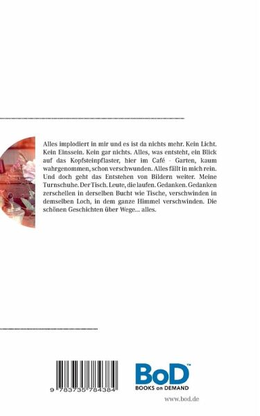 Alles implodiert in mir und es ist da nichts mehr. Kein Licht. Kein Einssein. Kein gar nichts. Alles, was entsteht, ein Blick auf das Kopfsteinpflaster, hier im Café - Garten, kaum wahrgenommen, schon verschwunden. Alles fällt in mich rein. Und doch geht das Entstehen von Bildern weiter. Meine Turnschuhe. Der Tisch. Leute, die laufen. Gedanken. Gedanken zerschellen in derselben Bucht wie Tische, verschwinden in demselben Loch, in dem ganze Himmel verschwinden. Die schönen Geschichten über Wege... alles.