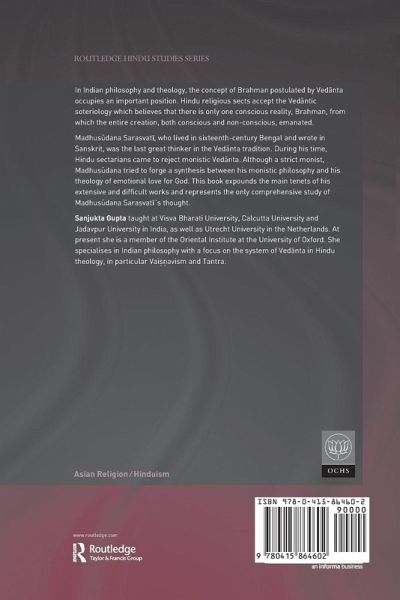 In Indian philosophy and theology, the ideology of Vedanta occupies an important position. Hindu religious sects accept the Vedantic soteriology, which believes that there is only one conscious reality, Brahman from which the entire creation, both conscious and non-conscious, emanated. Madhusudana Sarasvati, who lived in sixteenth century Bengal and wrote in Sanskrit, was the last great thinker among the Indian philosophers of Vedanta. During his time, Hindu sectarians, rejected monistic Vedanta. Although a strict monist, Madhusudana tried to make a synthesis between his monistic philosophy and his theology of emotional love for God. Sanjukta Gupta provides the only comprehensive study of Madhusudana Sarasvati's thought. She explores the religious context of his extensive and difficult works, offering invaluable insights into Indian philosophy and theology.