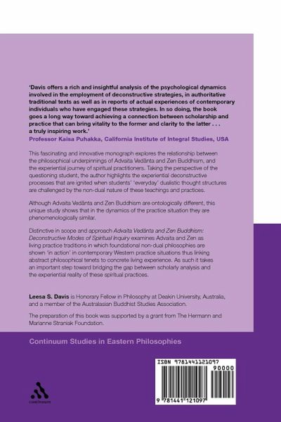 This fascinating and innovative book explores the relationship between the philosophical underpinnings of Advaita Vedanta, Zen Buddhism and the experiential journey of spiritual practitioners. Taking the perspective of the questioning student, the author highlights the experiential deconstructive processes that are ignited when students' "everyday" dualistic thought structures are challenged by the non-dual nature of these teachings and practices. Although Advaita Vedanta and Zen Buddhism are ontologically different, this unique study shows that in the dynamics of the practice situation they are phenomenologically similar. Distinctive in scope and approach Advaita Vedanta and Zen Buddhism: Deconstructive Modes of Spiritual Inquiry examines Advaita and Zen as living practice traditions in which foundational non-dual philosophies are shown "in action" in contemporary Western practice situations thus linking abstract philosophical tenets to concrete living experience. As such it takes an important step toward bridging the gap between scholarly analysis and the experiential reality of these spiritual practices.