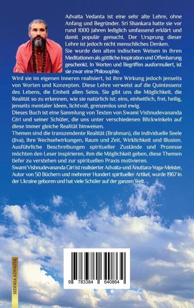 Advaita Vedanta ist eine sehr alte Lehre, ohne Anfang und Begründer. Sri Shankara hatte sie vor rund 1000 Jahren lediglich umfassend erklärt und damit populär gemacht. Der Ursprung dieser Lehre liegt jedoch nicht im menschlichen Denken. Sie wurde den alten indischen Weisen in ihren Meditationen als göttliche Inspiration und Offenbarung geschenkt. In Worten und Begriffen ausformuliert ist sie zwar eine Philosophie. Wird sie im eigenen Inneren realisiert, ist ihre Wirkung jedoch jenseits von Worten und Konzepten. Diese Lehre verweist auf die Quintessenz des Lebens, die Einheit allen Seins. Sie gibt uns die Möglichkeit, die Realität so zu erkennen, wie sie natürlich ist: eins, einheitlich, frei, heilig, jenseits mentaler Ideen, lichtvoll, grenzenlos und ewig.Advaita kann und muss im Zuge dieser Vertiefung aus verschiedenen Perspektiven betrachtet werden, um auch den damit verbundenen spirituellen Prozess wirklich zu verstehen. Dieses Buch versucht, dies den Lesern leichter zu machen. Es ist eine Sammlung von Texten von Swami Vishnudevananda Giri und seiner Schüler, die uns unter verschiedenen Blickwinkeln auf diese immer gleiche Realität hinweisen. Für jeden gedanklichen Ansatz, sich Advaita anzunähern, also kein eigenes Buch, sondern ein konzentrierter Essay. Das spart Zeit. Diese Textsammlung soll einen vertieften Überblick über den Weg und das Ziel der spirituellen Verwirklichung in der Advaita Vedanta-Tradition geben.In diesem Buch erfahren Sie mehr über Themen wie die transzendente Realität (Brahman), die individuelle Seele (Jiva), ihre Wechselwirkungen, Raum und Zeit, Wirklichkeit und Illusion. Beschreibungen spiritueller Zustände und Prozesse machen die Natur des eigenen Bewusstseins klarer. Die Advaita-Grundprinzipien - Einheit und Nicht-Dualität des Bewusstseins und seine natürliche Göttlichkeit - sind letztlich spiritueller Kern vieler Religionen. Diese Essenz des Advaita, die unabhängig von den kulturgeprägten Religionen ist, arbeiten die einzelnen Aufsätze heraus.