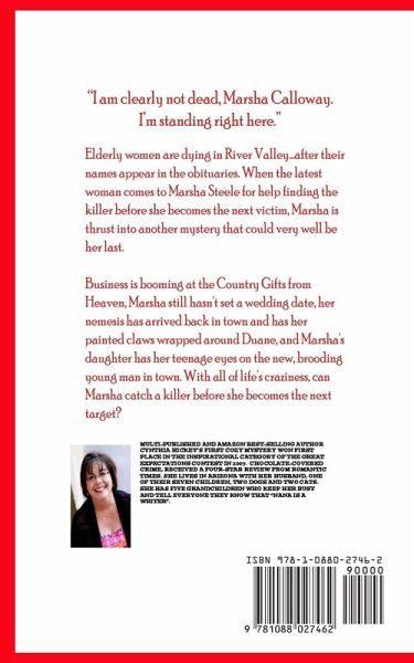 Elderly women are dying in River Valley... ...after their names appear in the obituaries. When the latest woman comes to Marsha Steele for help finding the killer before she becomes the next victim, Marsha is thrust into another mystery that could very well be her last. Business is booming at the Country Gifts from Heaven, Marsha still hasn't set a wedding date, her nemesis has arrived back in town and has her painted claws wrapped around Duane, and Marsha's daughter has her teenage eyes on the new, brooding young man in town. With all of life's craziness, can Marsha catch a killer before she becomes the next target? The second small town cozy mystery featuring Marsha and her friends.