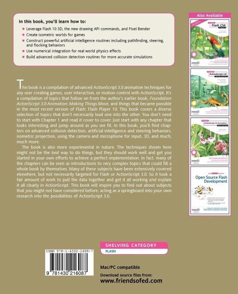 This book is a compilation of advanced ActionScript 3.0 animation techniques for any user creating games, user interaction, or motion control with ActionScript. It's an anthology of topics that follow from the author's earlier book, Foundation ActionScript 3.0 Animation: Making Things Move, and things that became possible in version 10 of Flash Player. This book covers a diverse selection of topics that don't necessarily lead one into the other. You don't need to start with Chapter 1 and read it cover to cover. Just start with any chapter that looks interesting and jump around as you see fit. In this book, you'll find chapters on advanced collision detection, artificial intelligence and steering behaviors, isometric projection, using the camera and microphone for input, 3D, and much, much more.