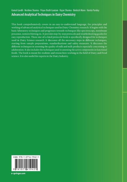 This book comprehensively covers in an easy-to-understand language, the principles and working of advanced analytical techniques used in Dairy Chemistry research. It begins with the basic laboratory techniques and progresses towards techniques like spectroscopy, membrane processes, western blotting etc. It provides step-by-step protocols and troubleshooting guides for easy reproduction. These one-of-a-kind protocols book is specifically designed for techniques used in Dairy Science research. It discusses all the necessary steps in different techniques, starting from sample preparations, standardizations and safety measures. It discusses the different techniques in assessing the quality of milk and milk products especially concerning to adulteration. It also includes the techniques used in assessing the active components in functionalfoods. The book is meant for students and researchers working in the field of Dairy and Food science. It is also useful for experts in the Dairy Industry.