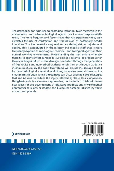 The probability for exposure to damaging radiation, toxic chemicals in the environment and adverse biological agents has increased exponentially today. The more frequent and faster travel that we experience today also escalates the risk of contraction and transmission of potentially deadly infections. This has created a very real and escalating risk for injuries and deaths. This is accentuated in the military and medical staff that is more frequently exposed to radiological, chemical, and biological agents in their normal working environment. Understanding the mechanisms whereby these toxic agents inflict damage to our bodies is essential to prepare us for these challenges.Much of the damage is inflicted through the generation of free radicals and non-radical oxidants which then act through oxidative mechanisms to injury the body. This volume will discuss the damage caused by these radiological, chemical, and biological environmental stressors, the mechanisms through which the damage can occur and the novel strategies that can be used to reduce the injury inflicted by these toxic compounds. Using basic and clinical research approaches, the contents of this book discuss new ideas for the development of bioactive products and environmental approaches to lessen or negate the biological damage inflicted by thesenoxious compounds.
