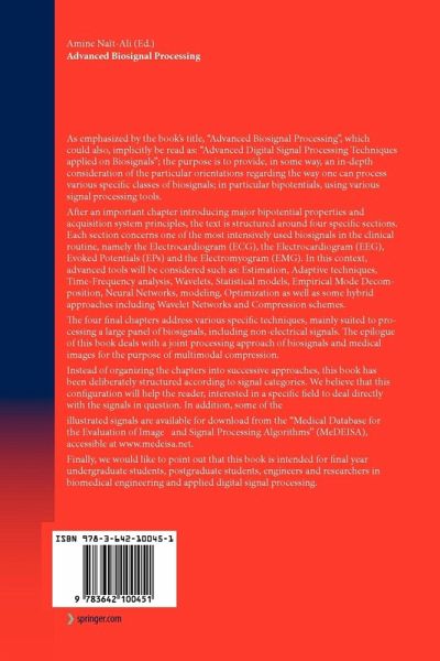 Generally speaking, Biosignals refer to signals recorded from the human body. They can be either electrical (e. g. Electrocardiogram (ECG), Electroencephalogram (EEG), Electromyogram (EMG), etc. ) or non-electrical (e. g. breathing, movements, etc. ). The acquisition and processing of such signals play an important role in clinical routines. They are usually considered as major indicators which provide clinicians and physicians with useful information during diagnostic and monitoring processes. In some applications, the purpose is not necessarily medical. It may also be industrial. For instance, a real-time EEG system analysis can be used to control and analyze the vigilance of a car driver. In this case, the purpose of such a system basically consists of preventing crash risks. Furthermore, in certain other appli- tions,asetof biosignals (e. g. ECG,respiratorysignal,EEG,etc. ) can be used toc- trol or analyze human emotions. This is the case of the famous polygraph system, also known as the "lie detector", the ef ciency of which remains open to debate! Thus when one is dealing with biosignals, special attention must be given to their acquisition, their analysis and their processing capabilities which constitute the nal stage preceding the clinical diagnosis. Naturally, the diagnosis is based on the information provided by the processing system.