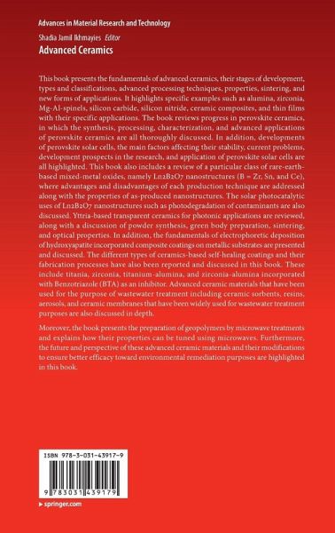 This book presents the fundamentals of advanced ceramics, their stages of development, types and classifications, advanced processing techniques, properties, sintering, and new forms of applications. It highlights specific examples such as alumina, zirconia, Mg-Al-spinels, silicon carbide, silicon nitride, ceramic composites, and thin films with their specific applications. The book reviews progress in perovskite ceramics, in which the synthesis, processing, characterization, and advanced applications of perovskite ceramics are all thoroughly discussed. In addition, developments of perovskite solar cells, the main factors affecting their stability, current problems, development prospects in the research, and application of perovskite solar cells are all highlighted. This book also includes a review of a particular class of rare-earth-based mixed-metal oxides, namely Ln2B2O7 nanostructures (B = Zr, Sn, and Ce), where advantages and disadvantages of each production technique are addressed along with the properties of as-produced nanostructures. The solar photocatalytic uses of Ln2B2O7 nanostructures such as photodegradation of contaminants are also discussed. Yttria-based transparent ceramics for photonic applications are reviewed, along with a discussion of powder synthesis, green body preparation, sintering, and optical properties. In addition, the fundamentals of electrophoretic deposition of hydroxyapatite incorporated composite coatings on metallic substrates are presented and discussed. The different types of ceramics-based self-healing coatings and their fabrication processes have also been reported and discussed in this book. These include titania, zirconia, titanium-alumina, and zirconia-alumina incorporated with Benzotriazole (BTA) as an inhibitor. Advanced ceramic materials that have been used for the purpose of wastewater treatment including ceramic sorbents, resins, aerosols, and ceramic membranes that have been widely used for wastewater treatment purposes are also discussed in depth.