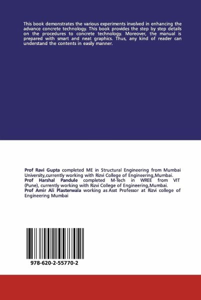 This book demonstrates the various experiments involved in enhancing the advance concrete technology. This book provides the step by step details on the procedures to concrete technology. Moreover, the manual is prepared with smart and neat graphics. Thus, any kind of reader can understand the contents in easily manner.