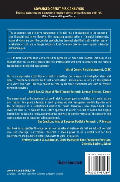 The assessment and effective management of credit risk is fundamental to the success of any financial institution. However, the increasing sophistication of financial instruments, many of which are over-the-counter products, has demonstrated that traditional methods of evaluation of risk are no longer adequate. Even "common practice" now requires advanced methodologies. "...The first comprehensive and detailed compendium of credit risk models. This book is an absolute must for all the students and risk professionals who need to understand the modern foundations of credit risk management." Michel Crouhy, Risk Management, CIBC "This is an impressive exposition of credit risk matters. Every angle is investigated: structural models, reduced-form models, credit risk of derivatives, and empirical results are all explained with verve and rigor. This book should be read by all credit specialists who care to venture beyond the obvious." Jamil Baz, Co-Head of Fixed Income Research, Lehman Brothers, Europe "The measurement and management of credit risk has undergone a revolutionary transformation over the past few years. Advances in credit pricing and risk management models, together with the development of a sophisticated market for credit derivatives, have forced banks and investors alike to re-evaluate their entire approach to credit risk. Didier Cossin and Hugues Pirotte have delivered a timely, comprehensive and well-balanced synthesis of the concepts and models underpinning modern credit management." Guy Coughlan, Head of European Portfolio Research, J.P. Morgan "This book has assembled the major results on the value of instruments that are subject to credit risk. The coverage is extensive. Therefore it should prove to be a useful text for both practitioners and graduate students who wish to work in this area." Professor Suresh M. Sundaresan, Chase Manhattan Bank Foundation Professor, Columbia Business School