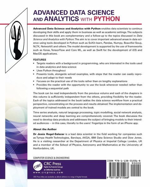 Advanced Data Science and Analytics with Python enables data scientists to continue developing their skills and apply them in business as well as academic settings. The subjects discussed in this book are complementary and a follow-up to the topics discussed in Data Science and Analytics with Python. The aim is to cover important advanced areas in data science using tools developed in Python such as SciKit-learn, Pandas, Numpy, Beautiful Soup, NLTK, NetworkX and others. The model development is supported by the use of frameworks such as Keras, TensorFlow and Core ML, as well as Swift for the development of iOS and MacOS applications.