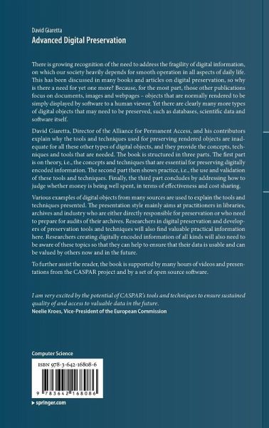David Giaretta, Director of the Alliance for Permanent Access, and his contributors explain why the tools and techniques used for preserving rendered objects are inadequate for all these other types of digital objects, and they provide the concepts, techniques and tools that are needed. The book is structured in three parts. The first part is on theory, i.e., the concepts and techniques that are essential for preserving digitally encoded information. The second part then shows practice, i.e., the use and validation of these tools and techniques. Finally, the third part concludes by addressing how to judge whether money is being well spent, in terms of effectiveness and cost sharing.