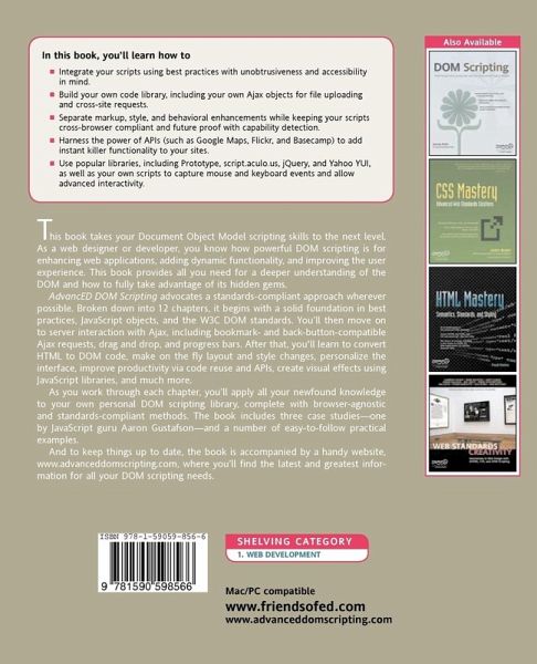 DOM Scripting in Detail.- Do It Right with Best Practices.- Creating Your Own Reusable Objects.- Understanding the DOM2 Core and DOM2 HTML.- Responding to User Actions and Events.- Dynamically Modifying Style and Cascading Style Sheets.- Case Study: A Photo Cropping and Resizing Tool.- Communicating outside the Browser.- Adding Ajax to the Mix.- Case Study: Enabling Asynchronous File Uploads with Progress Indicators.- Some Great Source.- Using Libraries to Increase Productivity.- Adding Effects to Enhance User Experience.- Mashups Galore! Using APIs to Add Maps, Searching, and Much More.- Case Study: Style Your Select with the DOM.
