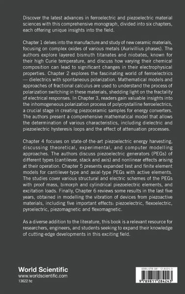 Discover the latest advances in ferroelectric and piezoelectric material sciences with this comprehensive monograph, divided into six chapters, each offering unique insights into the field. Chapter 1 delves into the manufacture and study of new ceramic materials, focusing on complex oxides of various metals (Aurivillius phases). The authors explore layered bismuth titanates and niobates, known for their high Curie temperature, and discuss how varying their chemical composition can lead to significant changes in their electrophysical properties. Chapter 2 explores the fascinating world of ferroelectrics - dielectrics with spontaneous polarization. Mathematical models and approaches of fractional calculus are used to understand the process of polarization switching in these materials, shedding light on the fractality of electrical responses. In Chapter 3, readers gain valuable insights into the inhomogeneous polarization process of polycrystalline ferroelectrics, a crucial stage in creating piezoceramic samples for energy converters. The authors present a comprehensive mathematical model that allows the determination of various characteristics, including dielectric and piezoelectric hysteresis loops and the effect of attenuation processes. Chapter 4 focuses on state-of-the-art piezoelectric energy harvesting, discussing theoretical, experimental, and computer modelling approaches. The authors discuss piezoelectric generators (PEGs) of different types (cantilever, stack and axis) and nonlinear effects arising at their operation. Chapter 5 presents expanded test and finite element models for cantilever-type and axial-type PEGs with active elements. The studies cover various structural and electric schemes of the PEGs with proof mass, bimorph and cylindrical piezoelectric elements, and excitation loads. Finally, Chapter 6 reviews some results in the last five years, obtained in modelling the vibration of devices from piezoactive materials, including five important effects: piezoelectric, flexoelectric, pyroelectric, piezomagnetic and flexomagnetic. As a diverse addition to the literature, this book is a relevant resource for researchers, engineers, and students seeking to expand their knowledge of cutting-edge developments in this exciting field.