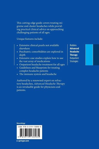 "Advanced Headache Therapy, is Dr. Robbins 4th headache book and it fully covers 'standard' outpatient headache treatment. ... Dr. Robbins, who has published extensively on refractory headaches, has written a practical 'real world' guide to outpatient treatment. It is a welcome addition to my library." (Duren Michael Ready, The Journal of Headache and Pain, Vol. 16, 2015)