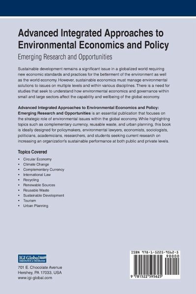 Sustainable development remains a significant issue in a globalized world requiring new economic standards and practices for the betterment of the environment as well as the world economy. However, sustainable economics must manage environmental solutions to issues on multiple levels and within various disciplines. There is a need for studies that seek to understand how environmental economics and governance within small and large sectors affect the capability and wellbeing of the global economy. Advanced Integrated Approaches to Environmental Economics and Policy: Emerging Research and Opportunities is an essential publication that focuses on the strategic role of environmental issues within the global economy. While highlighting topics such as complementary currency, reusable waste, and urban planning, this book is ideally designed for policymakers, environmental lawyers, economists, sociologists, politicians, academicians, researchers, and students seeking current research on increasing an organization's sustainable performance at both public and private levels.