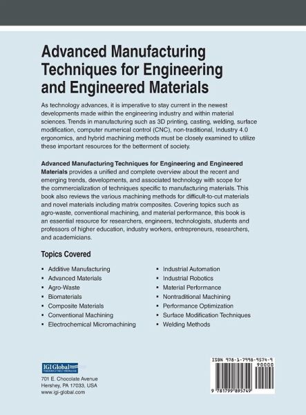 As technology advances, it is imperative to stay current in the newest developments made within the engineering industry and within material sciences. Trends in manufacturing such as 3D printing, casting, welding, surface modification, computer numerical control (CNC), non-traditional, Industry 4.0 ergonomics, and hybrid machining methods must be closely examined to utilize these important resources for the betterment of society. Advanced Manufacturing Techniques for Engineering and Engineered Materials provides a unified and complete overview about the recent and emerging trends, developments, and associated technology with scope for the commercialization of techniques specific to manufacturing materials. This book also reviews the various machining methods for difficult-to-cut materials and novel materials including matrix composites. Covering topics such as agro-waste, conventional machining, and material performance, this book is an essential resource for researchers, engineers, technologists, students and professors of higher education, industry workers, entrepreneurs, researchers, and academicians.