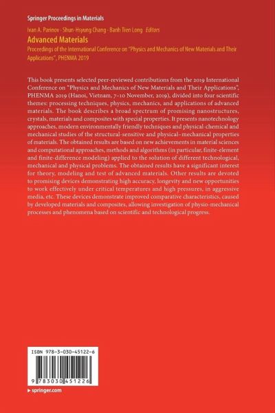 This book presents selected peer-reviewed contributions from the 2019 International Conference on "Physics and Mechanics of New Materials and Their Applications", PHENMA 2019 (Hanoi, Vietnam, 7-10 November, 2019), divided into four scientific themes: processing techniques, physics, mechanics, and applications of advanced materials. The book describes a broad spectrum of promising nanostructures, crystals, materials and composites with special properties. It presents nanotechnology approaches, modern environmentally friendly techniques and physical-chemical and mechanical studies of the structural-sensitive and physical-mechanical properties of materials. The obtained results are based on new achievements in material sciences and computational approaches, methods and algorithms (in particular, finite-element and finite-difference modeling) applied to the solution of different technological, mechanical and physical problems. The obtained results have a significant interest fortheory, modeling and test of advanced materials. Other results are devoted to promising devices demonstrating high accuracy, longevity and new opportunities to work effectively under critical temperatures and high pressures, in aggressive media, etc. These devices demonstrate improved comparative characteristics, caused by developed materials and composites, allowing investigation of physio-mechanical processes and phenomena based on scientific and technological progress.