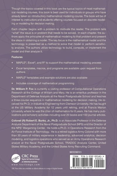 Dr. William P. Fox is currently a visiting professor of Computational Operations Research at the College of William and Mary. He is an emeritus professor in the Department of Defense Analysis at the Naval Postgraduate School and teaches a three-course sequence in mathematical modeling for decision making. He received his Ph.D. in Industrial Engineering from Clemson University. He has taught at the United States Military Academy for twelve years until retiring and at Francis Marion University where he was the chair of mathematics for eight years. He has many publications and scholarly activities including twenty plus books and one hundred and fifty journal articles. Colonel (R) Robert E. Burks, Jr., Ph.D. is an Associate Professor in the Defense Analysis Department of the Naval Postgraduate School (NPS) and the Director of the NPS' Wargaming Center. He holds a Ph.D. in Operations Research from the Air Force Institute of Technology. He is a retired logistics Army Colonel with more than thirty years of military experience in leadership, advanced analytics, decision modeling, and logistics operations who served as an Army Operations Research analyst at the Naval Postgraduate School, TRADOC Analysis Center, United States Military Academy, and the United States Army Recruiting Command.
