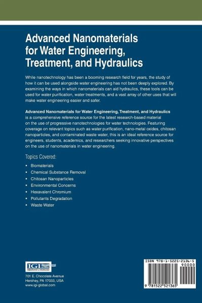 While nanotechnology has been a booming research field for years, the study of how it can be used alongside water engineering has not been deeply explored. By examining the ways in which nanomaterials can aid hydraulics, these tools can be used for water purification, water treatments, and a vast array of other uses that will make water engineering easier and safer. Advanced Nanomaterials for Water Engineering, Treatment, and Hydraulics is a comprehensive reference source for the latest research-based material on the use of progressive nanotechnologies for water technologies. Featuring coverage on relevant topics such as water purification, nano-metal oxides, chitosan nanoparticles, and contaminated waste water, this is an ideal reference source for engineers, students, academics, and researchers seeking innovative perspectives on the use of nanomaterials in water engineering.