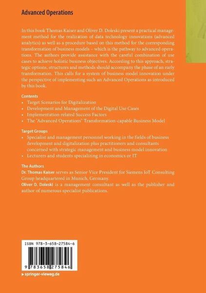 In this book, Thomas Kaiser and Oliver D. Doleski present a practical management method for the realization of data technology innovations (advanced analytics) as well as a procedure based on this method for the corresponding transformation of business models - which is the pathway to advanced operations. The authors provide assistance with the careful combination of use cases to achieve holistic business objectives. According to this approach, strategic options, structures and methods should accompany the phase of an early transformation. This calls for a system of business model innovation under the perspective of implementing such an Advanced Operations as introduced by this book.