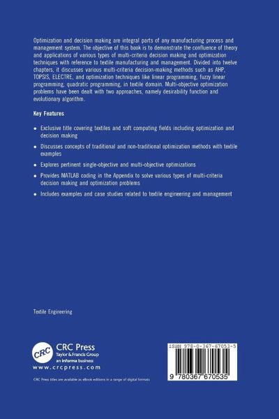 Optimization and decision making are integral parts of any manufacturing process and management system. The objective of this book is to demonstrate the confluence of theory and applications of various types of multi-criteria decision making and optimization techniques with reference to textile manufacturing and management. Divided into twelve chapters, it discusses various multi-criteria decision-making methods such as AHP, TOPSIS, ELECTRE, and optimization techniques like linear programming, fuzzy linear programming, quadratic programming, in textile domain. Multi-objective optimization problems have been dealt with two approaches, namely desirability function and evolutionary algorithm. Key Features Exclusive title covering textiles and soft computing fields including optimization and decision making Discusses concepts of traditional and non-traditional optimization methods with textile examples Explores pertinent single-objective and multi-objective optimizations Provides MATLAB coding in the Appendix to solve various types of multi-criteria decision making and optimization problems Includes examples and case studies related to textile engineering and management