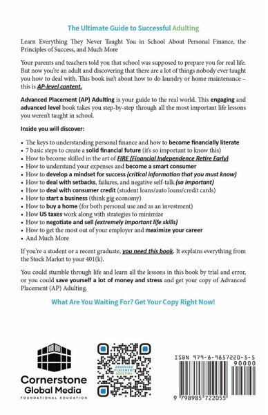 Do you want to learn ALL the things they never taught you in school? Could better insights into finance help you succeed in life? This book was written to help you with the most important things you were never taught! When you were a child it is more than likely that your parents, teachers and other educators told you that school was the place that would prepare you for real life. The problem is they were wrong. School rarely teaches us anything about the really important stuff, like managing finances, how to deal with failure and other things that are vitally important to our daily existence. Inside the pages of Advanced Placement (AP) Adulting: How to Manage Money, Develop A Mindset for Success, and Navigate Important Topics Not Taught in School, you will learn some of the most important life lessons that school never told you about, like: ¿ The keys to understanding personal finance¿ How to become skilled in the art of FIRE(Financial Independence Retire Early)¿ The 7 basic steps to financial security¿ Understanding your expenses and becoming a smart consumer¿ Developing a mindset for success¿ Dealing with setbacks¿ Buying a house or starting a business¿ How the US tax system works¿ How to negotiate and sell¿ And lots more... If you are a student or a recent graduate the chances are that you don't know how any of this works. To make sure that you are ahead of the curve before you become immersed in the real world get yourself a copy of Advanced Placement (AP) Adulting and make sure you learn the most important things you were never taught. We aren't going to teach you how to do your laundry or fix a leak but we WILL show you how to make adult life a success. What are you waiting for? Get your copy NOW!