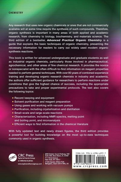 Any research that uses new organic chemicals, or ones that are not commercially available, will at some time require the synthesis of such compounds. Therefore, organic synthesis is important in many areas of both applied and academic research, from chemistry to biology, biochemistry, and materials science. The third edition of a bestseller, Advanced Practical Organic Chemistry is a guide that explains the basic techniques of organic chemistry, presenting the necessary information for readers to carry out widely used modern organic synthesis reactions. This book is written for advanced undergraduate and graduate students as well as industrial organic chemists, particularly those involved in pharmaceutical, agrochemical, and other areas of fine chemical research. It provides the novice or nonspecialist with the often difficult-to-find information on reagent properties needed to perform general techniques. With over 80 years combined experience training and developing organic research chemists in industry and academia, the authors offer sufficient guidance for researchers to perform reactions under conditions that give the highest chance of success, including the appropriate precautions to take and proper experimental protocols. The text also covers the following topics: