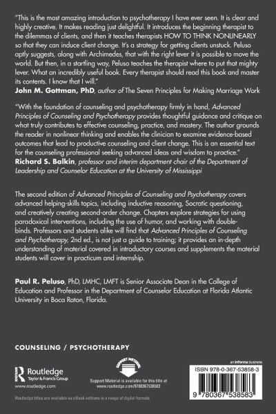 "With the foundation of counseling and psychotherapy firmly in hand, Advanced Principles of Counseling and Psychotherapy provides thoughtful guidance and critique on what truly contributes to effective counseling, practice, and mastery. The author grounds the reader in nonlinear thinking and enables the clinician to examine evidence-based outcomes that lead to productive counseling and client change. This is an essential text for the counseling professional seeking advanced ideas and wisdom to practice."