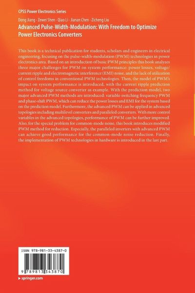 This book is a technical publication for students, scholars and engineers in electrical engineering, focusing on the pulse-width-modulation (PWM) technologies in power electronics area. Based on an introduction of basic PWM principles this book analyzes three major challenges for PWM on system performance: power losses, voltage/current ripple and electromagnetic interference (EMI) noise, and the lack of utilization of control freedoms in conventional PWM technologies. Then, the model of PWM's impact on system performance is introduced, with the current ripple prediction method for voltage source converter as example. With the prediction model, two major advanced PWM methods are introduced: variable switching frequency PWM and phase-shift PWM, which can reduce the power losses and EMI for the system based on the prediction model. Furthermore, the advanced PWM can be applied in advanced topologies including multilevel converters and paralleled converters. With more control variables in the advanced topologies, performance of PWM can be further improved. Also, for the special problem for common-mode noise, this book introduces modified PWM method for reduction. Especially, the paralleled inverters with advanced PWM can achieve good performance for the common-mode noise reduction. Finally, the implementation of PWM technologies in hardware is introduced in the last part.