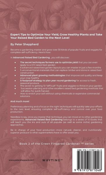 Paperback version has over 60 amazing black and white images, for colour images please choose the Hardback or eBook versions that have all images in glorious colour. Become a gardening master and grow over 30 kinds of popular fruits and veggies for complete self-sufficiency. ¿¿Here's how: Raised bed gardening is the perfect choice for a small backyard and even for indoor food production. Maintenance is a breeze, and you'll get optimal yields simply by following some of the best practices. You've probably experimented with gardening in the past, and your appetite for fresh, crunchy, and organic home produce has grown (literally and figuratively!). It's now time to take your gardening efforts to the next level. Can you really transform yourself into a raised bed gardening mastermind without having to enroll in costly courses or follow through with boring tutorials? The short answer is yes! Raised bed gardening is such a versatile approach, that you can tailor it to all of your needs. And once you bring advanced techniques to the table, you can: Make sure you have access to fresh seasonal fruits and veggies year-round Experiment with advanced layouts to grow a greater amount of plants Start a vertical garden to make the most of a space-starved backyard Plan your crops to give your family their favorite organic foods without having to spend a ton at farmer's markets Grow more challenging crops and make them thrive You don't need to be an agronomist to accomplish all of that. One single step will help you make the switch from an amateur gardener to an agricultural pro. That step involves building upon your basic skills to boost the effectiveness of raised bed gardening. In Advanced Raised Bed Gardening Guide, you will discover: The secret techniques farmers use to optimize yield that you can even apply to a DIY raised bed garden 6 advanced raised bed garden layouts you can master in just a few months 5 unconventional materials that can replace timber and stone in raised bed construction Advanced plant growing methodologies that improve soil quality and keep your crops healthy A foolproof strategy to plan year-round gardening for access to fresh, seasonal produce The secret to getting 10 "difficult" fruits and veggies to thrive in your garden Succession planting and other excellent raised bed gardening methods that will allow for quick harvest How to enrich your soil without using chemicals or expensive commercial solutions And much more! You don't need years of gardening experience to gain advanced raised bed knowledge. Preliminary planning and a focus on the right techniques will quickly take your efforts to the next level, ensuring complete self-sufficiency and control over your food production. On top of that, advanced raised bed gardening is a ton of fun and it allows you to unleash your full creative potential. Needless to say, once you master that technique, you can move on to other gardening experiments. Advanced Raised Bed Gardening Guide belongs to a series of 10 books that will teach you the ins and outs of all popular (as well as some niche) gardening approaches.. Be in charge of your food production--more natural, cleaner, and nutritionally-superior produce to what supermarkets have to offer await you.