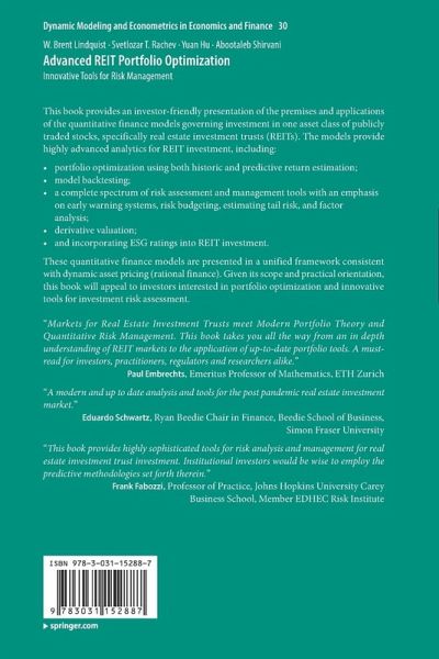 portfolio optimization using both historic and predictive return estimation; model backtesting; a complete spectrum of risk assessment and management tools with an emphasis on early warning systems, risk budgeting, estimating tail risk, and factor analysis; derivative valuation; and incorporating ESG ratings into REIT investment.