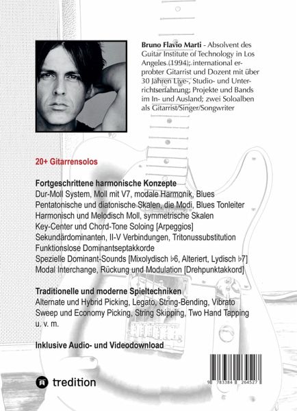Advanced Rock Lead Guitar Concepts Solo- und Improvisationskonzepte für Gitarre Mit seinem fast 300 Seiten umfassenden, multimedialen Buch «Advanced Rock Lead Guitar Concepts» präsentiert Marti eine Sammlung von mehr als zwanzig tendenziell anspruchsvollen Gitarrensolos inklusive deren harmonischen Analyse sowie vorhergehenden Erläuterungen der Materie und der angewandten Konzepte. Die Harmonielehrethemen sind praxisbezogen und gitarrenspezifisch dargestellt, beginnend mit dem Dur-Moll System (Funktionsharmonik), gefolgt von den Modi und Blues sowie schliesslich der erweiterten Harmonik. Darüber hinaus werden über das ganze Buch verteilt im Modulsystem Gitarrenspieltechniken erklärt und Sonderthemen behandelt. Stilistisch decken die Tracks hauptsächlich die Genres Rock, Pop und Blues ab. Die Solos beinhalten einerseits traditionelle wie auch moderne Licks und Spieltechniken. Um das Üben optimal zu unterstützen und die theoretischen Sachverhalte verständlicher zu machen, gibt es dazu einen Datendownload mit über hundert Audio- und Videofiles. Harmonische Konzepte: Dur-Moll System, Moll mit V7, modale Harmonik, Blues, pentatonische und diatonische Skalen, die Modi, Blues Tonleiter, Harmonisch und Melodisch Moll, symmetrische Skalen, Key-Center und Chord-Tone Soloing (Arpeggios), Sekundärdominanten, II-V Verbindungen, Tritonussubstitution, funktionslose Dominantseptakkorde, spezielle Dominant-Sounds, Modal Interchange, Rückung und Modulation Spieltechniken: Alternate und Hybrid Picking, Legato, String-Bending, Vibrato, Sweep und Economy Picking, String Skipping, Two Hand Tapping u. v. m.