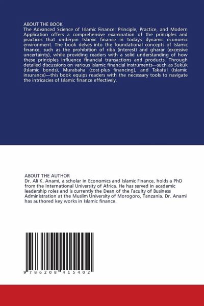 ABOUT THE BOOKThe Advanced Science of Islamic Finance: Principle, Practice, and Modern Application offers a comprehensive examination of the principles and practices that underpin Islamic finance in today's dynamic economic environment. The book delves into the foundational concepts of Islamic finance, such as the prohibition of riba (interest) and gharar (excessive uncertainty), while providing readers with a solid understanding of how these principles influence financial transactions and products. Through detailed discussions on various Islamic financial instruments-such as Sukuk (Islamic bonds), Murabaha (cost-plus financing), and Takaful (Islamic insurance)-this book equips readers with the necessary tools to navigate the intricacies of Islamic finance effectively.