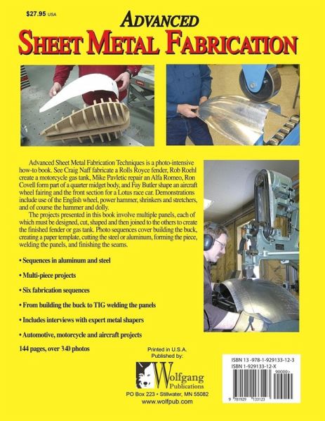 Advanced Sheet Metal Fabrication is a photo-intensive how-to book. See Craig Naff build a Rolls Royce fender, Rob Roehl create a motorcycle gas tank, Ron Covell form part of a quarter midget body and Fay Butler shape a aircraft wheel fairing. Methods and tools include English wheel, power hammer, shrinkers and stretchers, and of course the hammer and dolly. Learn form the experts how to weld the various panels into one complete, finished piece with minimal warpage - with either TIG or gas. 144 pages, 100% color.