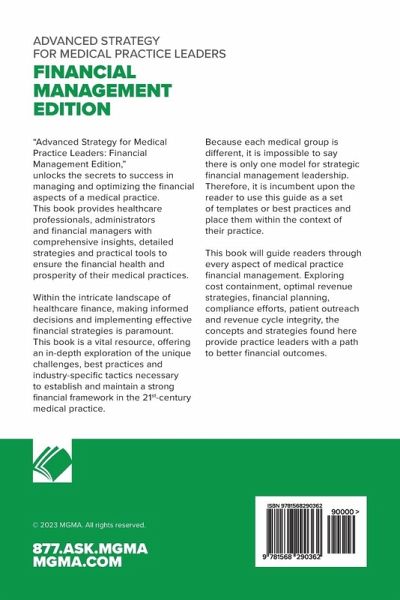 "Advanced Strategy for Medical Practice Leaders: Financial Management Edition," unlocks the secrets to success in managing and optimizing the financial aspects of a medical practice. This book provides healthcare professionals, administrators, and financial managers with comprehensive insights, detailed strategies and practical tools to ensure the financial health and prosperity of their medical practices. Within the intricate landscape of healthcare finance, making informed decisions and implementing effective financial strategies is paramount. This book is a vital resource, offering an in-depth exploration of the unique challenges, best practices and industry-specific tactics necessary to establish and maintain a strong financial framework in the 21st-century medical practice. Because each medical group is different, it is impossible to say there is only one model for strategic financial management leadership. Therefore, it is incumbent upon the reader to use this guide as a set of templates or best practices and place them within the context of their practice. This book will guide readers through every aspect of medical practice financial management. Exploring cost containment, optimal revenue strategies, financial planning, compliance efforts, patient outreach and revenue cycle integrity, the concepts and strategies found here provide practice leaders with a path to better financial outcomes.