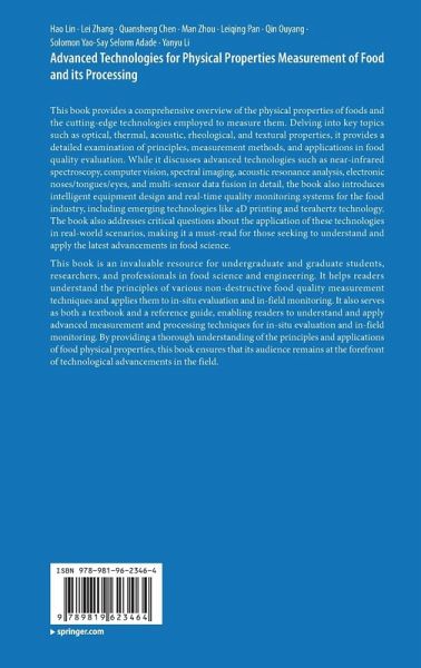 This book is an invaluable resource for undergraduate and graduate students, researchers, and professionals in food science and engineering. It helps readers understand the principles of various non-destructive food quality measurement techniques and applies them to in-situ evaluation and in-field monitoring. It also serves as both a textbook and a reference guide, enabling readers to understand and apply advanced measurement and processing techniques for in-situ evaluation and in-field monitoring. By providing a thorough understanding of the principles and applications of food physical properties, this book ensures that its audience remains at the forefront of technological advancements in the field.