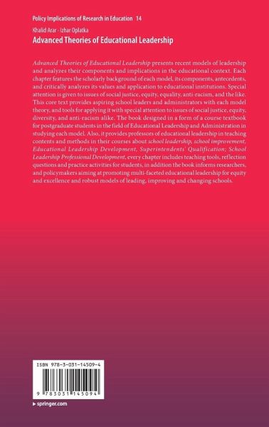 Advanced Theories of Educational Leadership presents recent models of leadership and analyzes their components and implications in the educational context. Each chapter features the scholarly background of each model, its components, antecedents, and critically analyzes its values and application to educational institutions. Special attention is given to issues of social justice, equity, equality, anti-racism, and the like. This core text provides aspiring school leaders and administrators with each model theory, and tools for applying it with special attention to issues of social justice, equity, diversity, and anti-racism alike. The book designed in a form of a course textbook for postgraduate students in the field of Educational Leadership and Administration in studying each model. Also, it provides professors of educational leadership in teaching contents and methods in their courses about school leadership, school improvement, Educational Leadership Development, Superintendents' Qualification; School Leadership Professional Development, every chapter includes teaching tools, reflection questions and practice activities for students, in addition the book informs researchers, and policymakers aiming at promoting multi-faceted educational leadership for equity and excellence and robust models of leading, improving and changing schools.