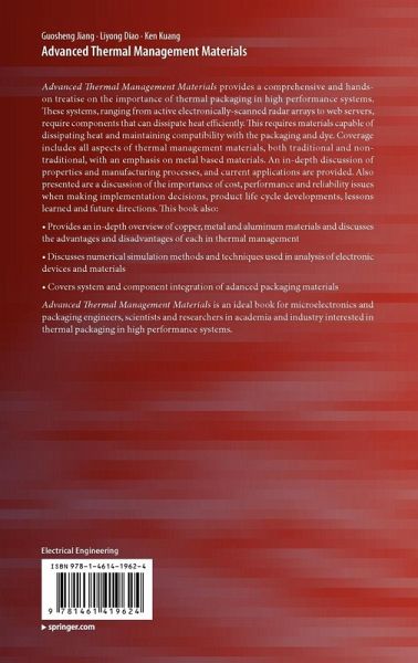 Provides an in-depth overview of copper, metal and aluminum materials and discusses the advantages and disadvantages of each in thermal management Discusses numerical simulation methods and techniques used in analysis of electronic devices and materials Covers system and component integration of advanced packaging materialsAdvanced Thermal Management Materials is an ideal book for microelectronics and packaging engineers, scientists and researchers in academia and industry interested in thermal packaging in high performance systems.