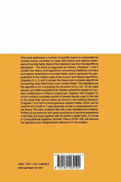 1. Fundamental Results and Algorithms in Dedekind Domains.- 1.1 Introduction.- 1.2 Finitely Generated Modules Over Dedekind Domains.- 1.3 Basic Algorithms in Dedekind Domains.- 1.4 The Hermite Normal Form Algorithm in Dedekind Domains.- 1.5 Applications of the HNF Algorithm.- 1.6 The Modular HNF Algorithm in Dedekind Domains.- 1.7 The Smith Normal Form Algorithm in Dedekind Domains.- 1.8 Exercises for Chapter 1.- 2. Basic Relative Number Field Algorithms.- 2.1 Compositum of Number Fields and Relative and Absolute Equations.- 2.2 Arithmetic of Relative Extensions.- 2.3 Representation and Operations on Ideals.- 2.4 The Relative Round 2 Algorithm and Related Algorithms.- 2.5 Relative and Absolute Representations.- 2.6 Relative Quadratic Extensions and Quadratic Forms.- 2.7 Exercises for Chapter 2.- 3. The Fundamental Theorems of Global Class Field Theory.- 3.1 Prologue: Hilbert Class Fields.- 3.2 Ray Class Groups.- 3.3 Congruence Subgroups: One Side of Class Field Theory.- 3.4 Abelian Extensions: The Other Side of Class Field Theory.- 3.5 Putting Both Sides Together: The Takagi Existence Theorem 154.- 3.6 Exercises for Chapter 3.- 4. Computational Class Field Theory.- 4.1 Algorithms on Finite Abelian groups.- 4.2 Computing the Structure of (?K/m)*.- 4.3 Computing Ray Class Groups.- 4.4 Computations in Class Field Theory.- 4.5 Exercises for Chapter 4.- 5. Computing Defining Polynomials Using Kummer Theory.- 5.1 General Strategy for Using Kummer Theory.- 5.2 Kummer Theory Using Hecke's Theorem When ?? ? K.- 5.3 Kummer Theory Using Hecke When ?? ? K.- 5.4 Explicit Use of the Artin Map in Kummer Theory When ?n ? K.- 5.5 Explicit Use of the Artin Map When ?n ? K.- 5.6 Two Detailed Examples.- 5.7 Exercises for Chapter 5.- 6. Computing Defining PolynomialsUsing Analytic Methods.- 6.1 The Use of Stark Units and Stark's Conjecture.- 6.2 Algorithms for Real Class Fields of Real Quadratic Fields.- 6.3 The Use of Complex Multiplication.- 6.4 Exercises for Chapter 6.- 7. Variations on Class and Unit Groups.- 7.1 Relative Class Groups.- 7.2 Relative Units and Regulators.- 7.3 Algorithms for Computing Relative Class and Unit Groups.- 7.4 Inverting Prime Ideals.- 7.5 Solving Norm Equations.- 7.6 Exercises for Chapter 7.- 8. Cubic Number Fields.- 8.1 General Binary Forms.- 8.2 Binary Cubic Forms and Cubic Number Fields.- 8.3 Algorithmic Characterization of the Set U.- 8.4 The Davenport-Heilbronn Theorem.- 8.5 Real Cubic Fields.- 8.6 Complex Cubic Fields.- 8.7 Implementation and Results.- 8.8 Exercises for Chapter 8.- 9. Number Field Table Constructions.- 9.1 Introduction.- 9.2 Using Class Field Theory.- 9.3 Using the Geometry of Numbers.- 9.4 Construction of Tables of Quartic Fields.- 9.5 Miscellaneous Methods (in Brief).- 9.6 Exercises for Chapter 9.- 10. Appendix A: Theoretical Results.- 10.1 Ramification Groups and Applications.- 10.2 Kummer Theory.- 10.3 Dirichlet Series with Functional Equation.- 10.4 Exercises for Chapter 10.- 11. Appendix B: Electronic Information.- 11.1 General Computer Algebra Systems.- 11.2 Semi-general Computer Algebra Systems.- 11.3 More Specialized Packages and Programs.- 11.4 Specific Packages for Curves.- 11.5 Databases and Servers.- 11.6 Mailing Lists, Websites, and Newsgroups.- 11.7 Packages Not Directly Related to Number Theory.- 12. Appendix C: Tables.- 12.1 Hilbert Class Fields of Quadratic Fields.- 12.2 Small Discriminants.- Index of Notation.- Index of Algorithms.- General Index.