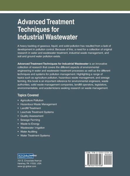 A heavy backlog of gaseous, liquid, and solid pollution has resulted from a lack of development in pollution control. Because of this, a need for a collection of original research in water and wastewater treatment, industrial waste management, and soil and ground water pollution exists. Advanced Treatment Techniques for Industrial Wastewater is an innovative collection of research that covers the different aspects of environmental engineering in water and wastewater treatment processes as well as the different techniques and systems for pollution management. Highlighting a range of topics such as agriculture pollution, hazardous waste management, and sewage farming, this book is an important reference for environmental engineers, waste authorities, solid waste management companies, landfill operators, legislators, environmentalists, and academicians seeking research on waste management.