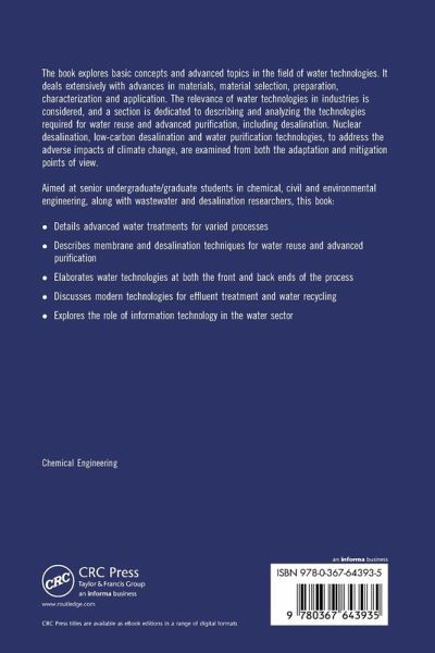 The book aims to provide the basic concepts and advanced topics in the field of water technologies in an easy to understand manner through desciption of advances in materials, material selection, preparation, characterization and application aspects including relevance of water technologies in industries.