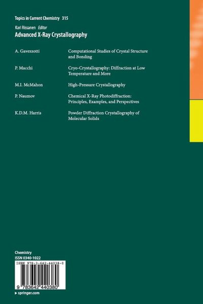 Computational Studies of Crystal Structure and Bonding, by Angelo GavezzottiCryo-Crystallography: Diffraction at Low Temperature and More, by Piero MacchiHigh-Pressure Crystallography, by Malcolm I. McMahonChemical X-Ray Photodiffraction: Principles, Examples, and Perspectives, by Pance NaumovPowder Diffraction Crystallography of Molecular Solids, by Kenneth D. M. Harris