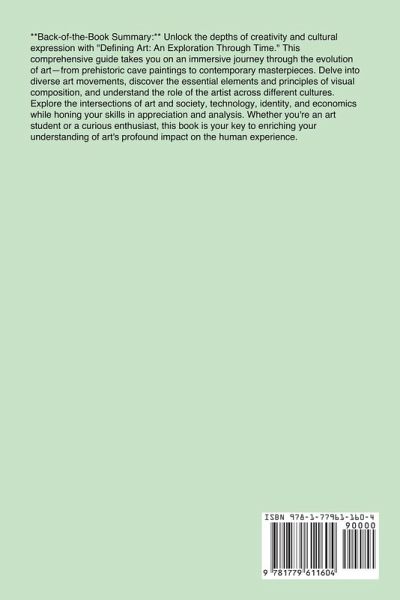 Unlock the depths of creativity and cultural expression with Defining Art: An Exploration Through Time. This comprehensive guide takes you on an immersive journey through the evolution of art-from prehistoric cave paintings to contemporary masterpieces. Delve into diverse art movements, discover the essential elements and principles of visual composition, and understand the role of the artist across different cultures. Explore the intersections of art and society, technology, identity, and economics while honing your skills in appreciation and analysis. Whether youre an art student or a curious enthusiast, this book is your key to enriching your understanding. arts profound impact on the human experience.of